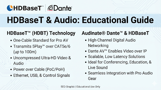 HDBaseT remains the king of simplicity for classrooms, conference rooms, and homes where you need rock-solid video and audio over a single cable. However, for massive scalability and complex audio routing across large facilities, AV-over-IP solutions like Dante represent the future of the industry.